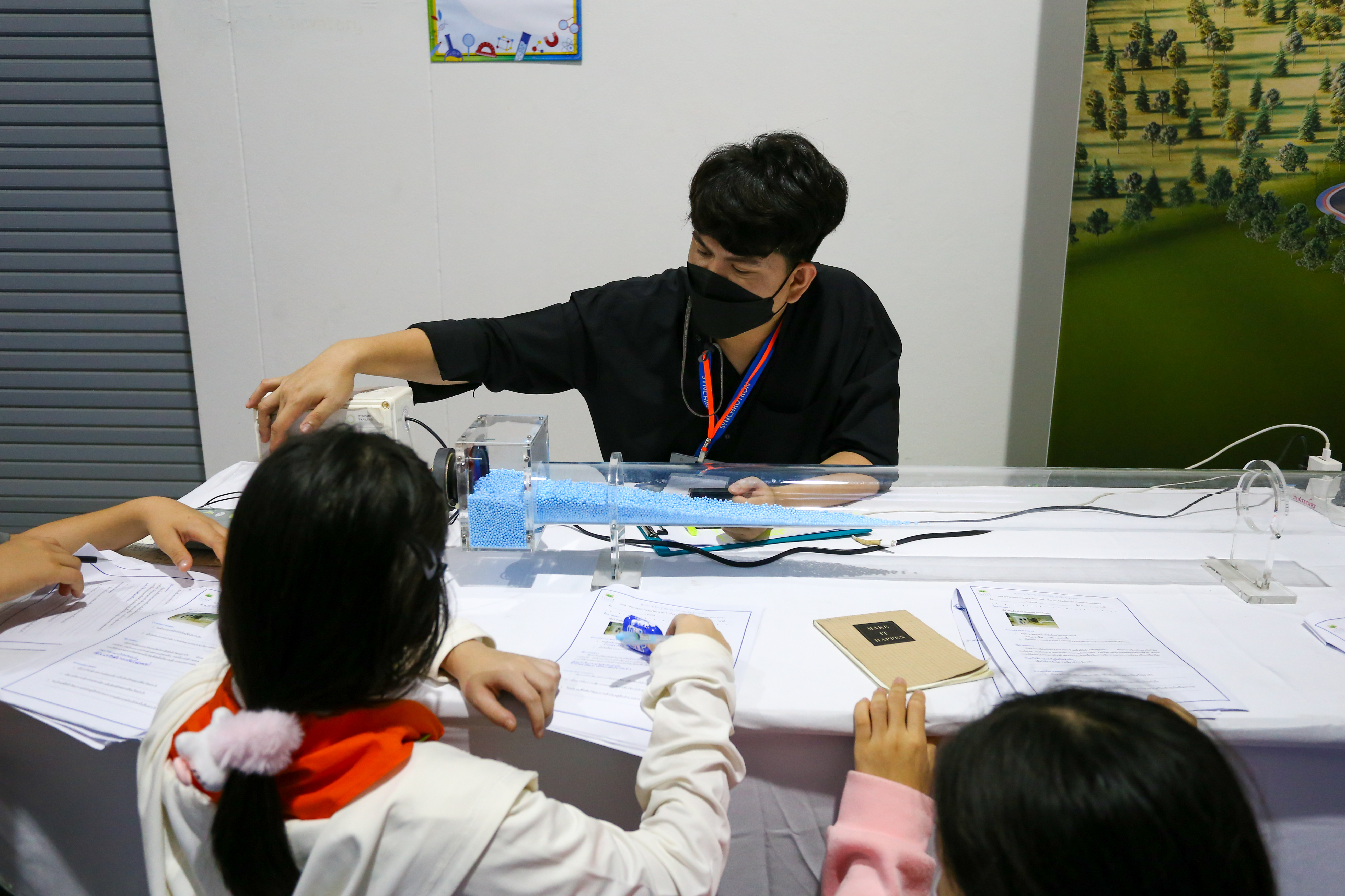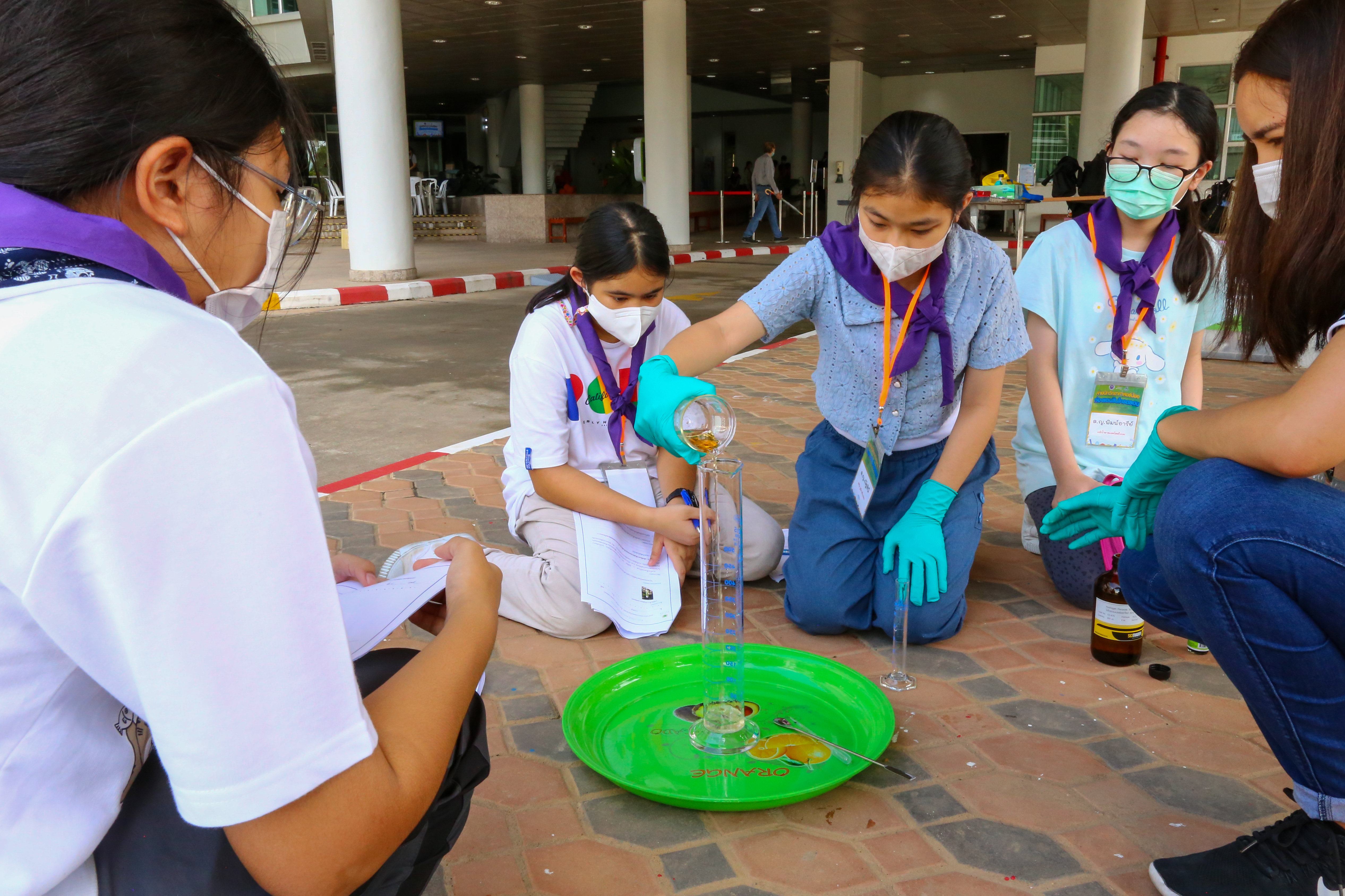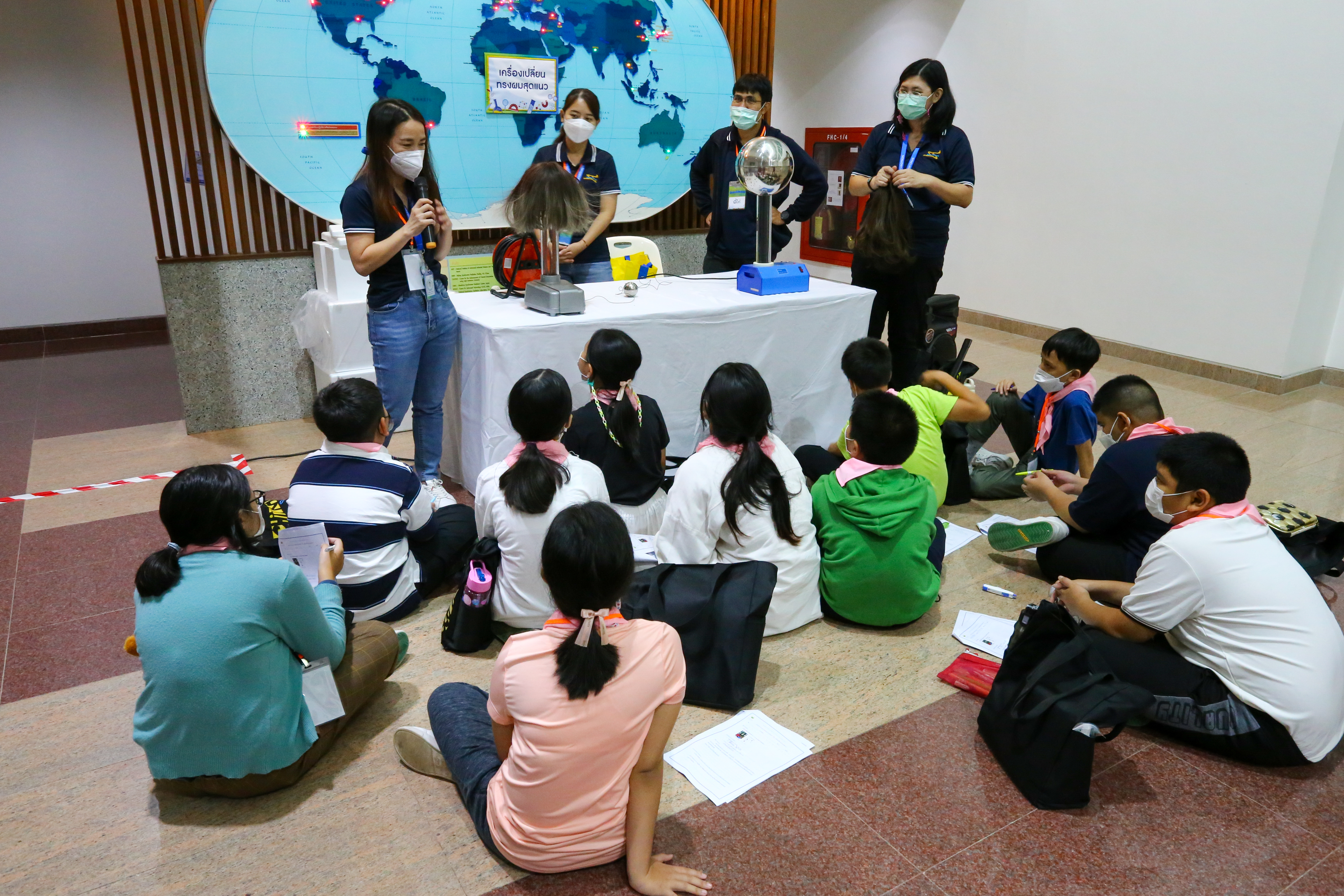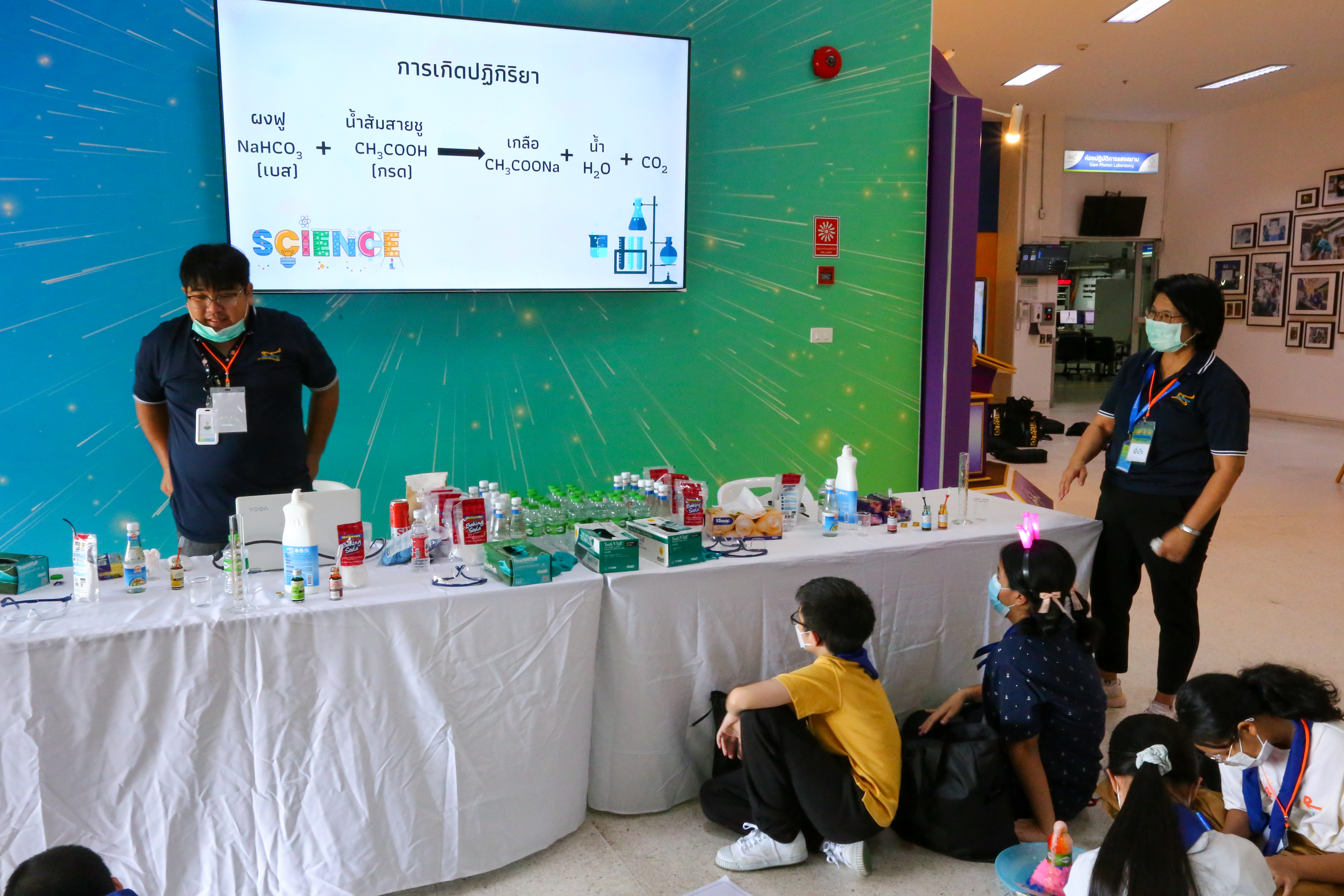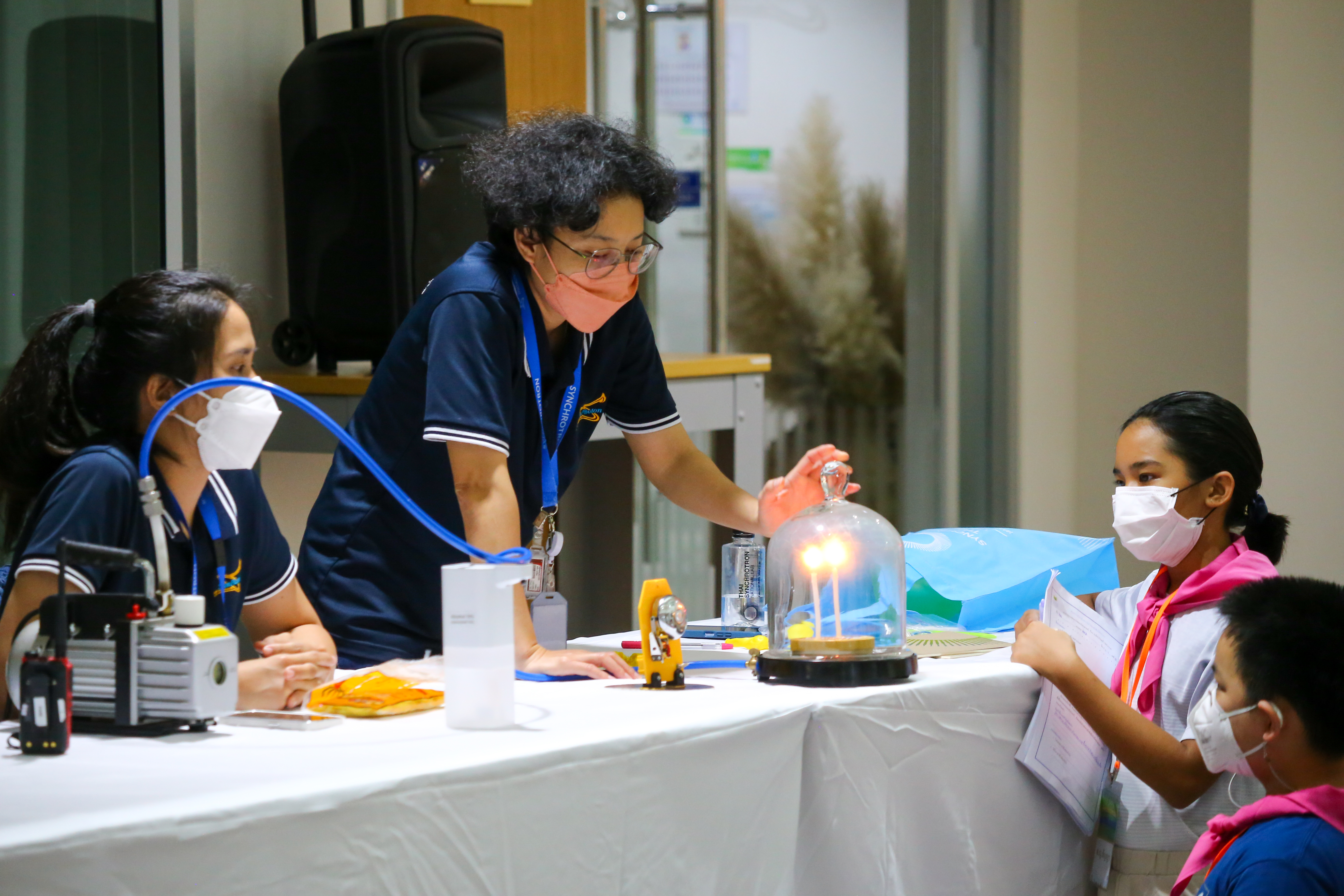 พี่ๆ นักวิทยาศาสตร์และผู้ช่วยนักวิจัยได้เตรียมฐานการทดลองให้น้องๆ ได้ร่วมสนุกถึง 10 ฐาน ได้แก่ ฐานกระดิ่งในโหลแก้ว ฐานสเปกตรัมคลื่นแม่เหล็กไฟฟ้า ฐานเครื่องเปลี่ยนทรงผมสุดแนว ฐานสิ่งมีชีวิตจิ๋วรอบตัว ฐานเม็ดโฟมเต้นระบำ ฐานภูเขาไฟระเบิด ฐานท่อถ่วงเวลา ฐาน Safe my life (Balloon) และฐานยาสีฟันช้าง พร้อมทั้งให้ความรู้ระหว่างทำกิจกรรมแต่ละฐานด้วย