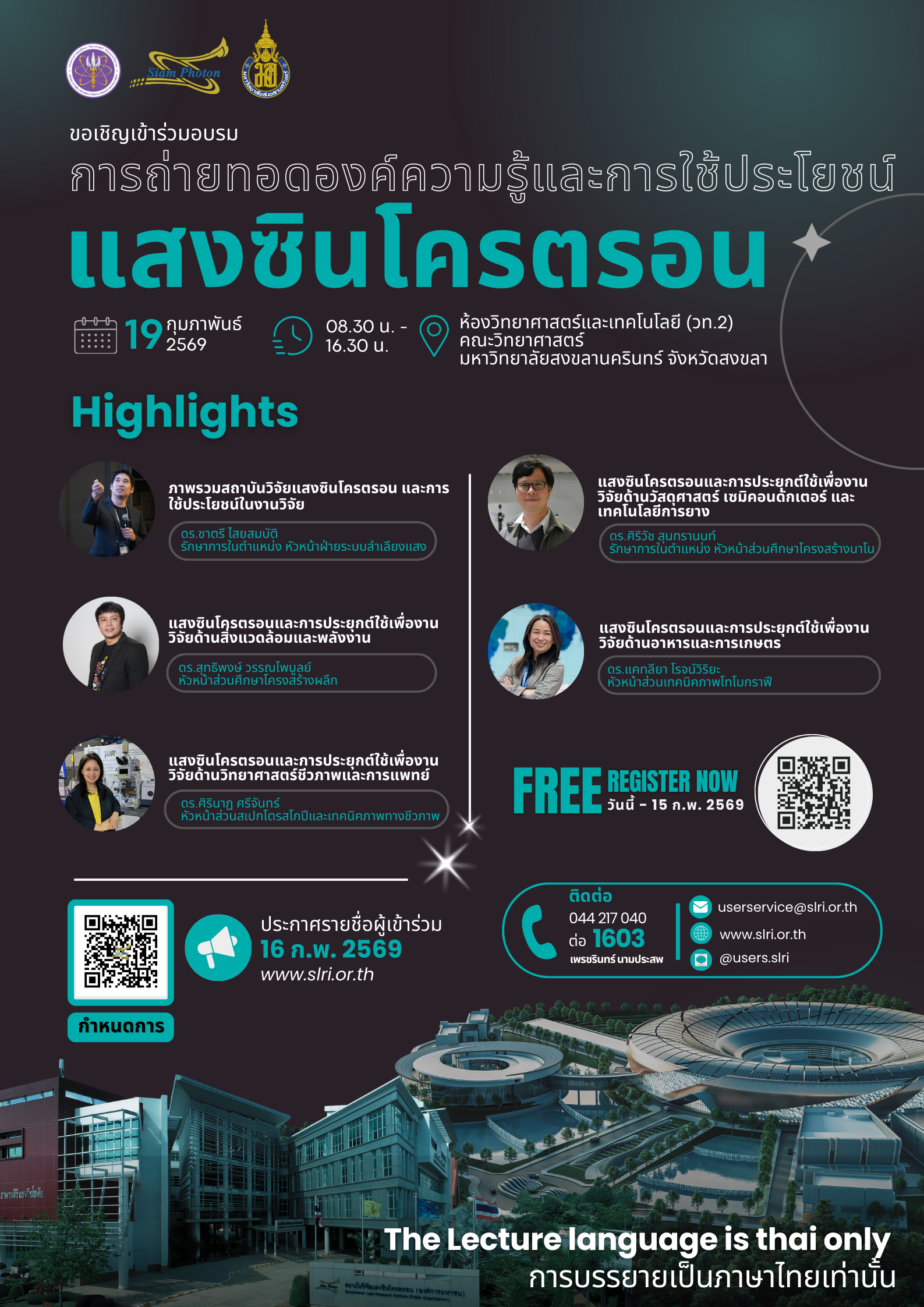 ฝ่ายระบบลำเลียงแสง จึงมีกำหนดจัดโครงการถ่ายทอดองค์ความรู้และการใช้ประโยชน์แสงซินโครตรอน ซึ่งประกอบด้วย การบรรยายเชิงวิชาการ การแลกเปลี่ยนข้อคิดเห็นและตอบข้อซักถามกับนักวิทยาศาสตร์ผู้เชี่ยวชาญ การหารือแนวทางการทำงานวิจัยร่วมกัน การสร้างเครือข่ายวิจัย ตลอดจนการเยี่ยมชมห้องปฏิบัติการของมหาวิทยาลัย เพื่อสนับสนุนการพัฒนางานวิจัยที่มีศักยภาพสูงในอนาคต โดยมีกลุ่มเป้าหมายประกอบด้วยคณาจารย์ นักวิจัย และนักศึกษาระดับบัณฑิตศึกษาจากคณะวิทยาศาสตร์ คณะวิศวกรรมศาสตร์ คณะเภสัชศาสตร์ และสาขาอื่นที่เกี่ยวข้อง
