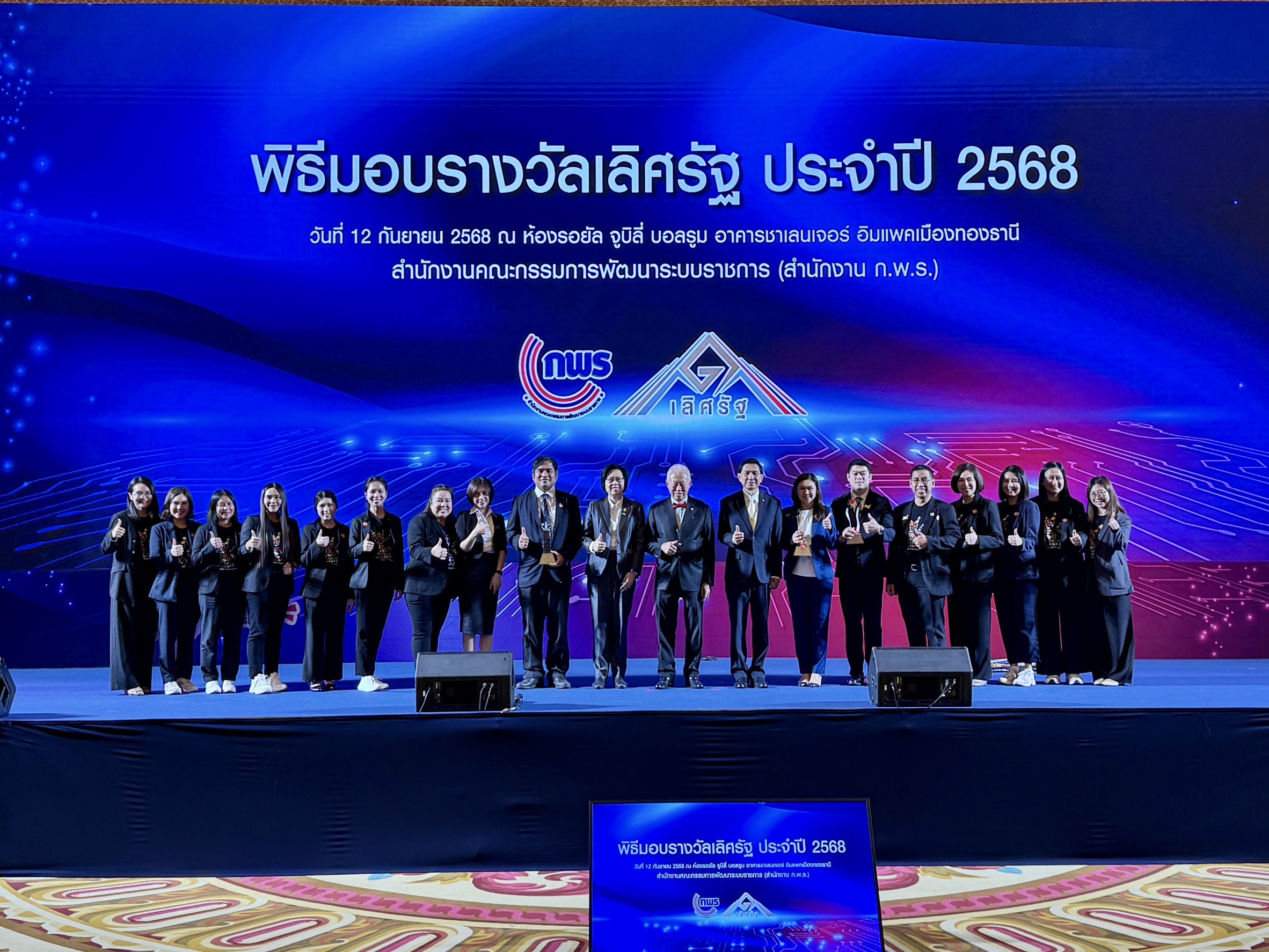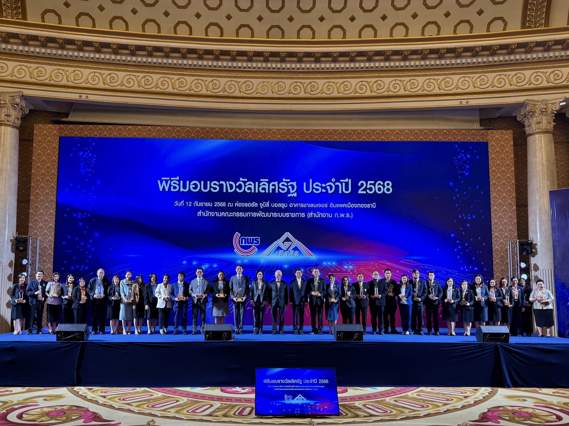 สำนักงานคณะกรรมการพัฒนาระบบราชการ (สำนักงาน ก.พ.ร.) จัดงานเสวนาวิชาการและพิธีมอบรางวัลเลิศรัฐ ประจำปี 2568 “ภาครัฐอัจฉริยะ ขับเคลื่อนอนาคต Smart Government & Smart Services: Driving for the Future” เพื่อเชิดชูเกียรติและเผยแพร่ต้นแบบผลการพัฒนาที่โดดเด่นของหน่วยงานที่ได้รับรางวัล ในวันศุกร์ที่ 12 กันยายน 2568 ณ ห้องรอยัล จูบิลี่ บอลรูม อาคารชาเลนเจอร์ อิมแพคเมืองทองธานี จังหวัดนนทบุรี โดยมี ศาสตราจารย์กิตติคุณบวรศักดิ์ อุวรรณโณ เป็นประธานในพิธีมอบรางวัลในครั้งนี้